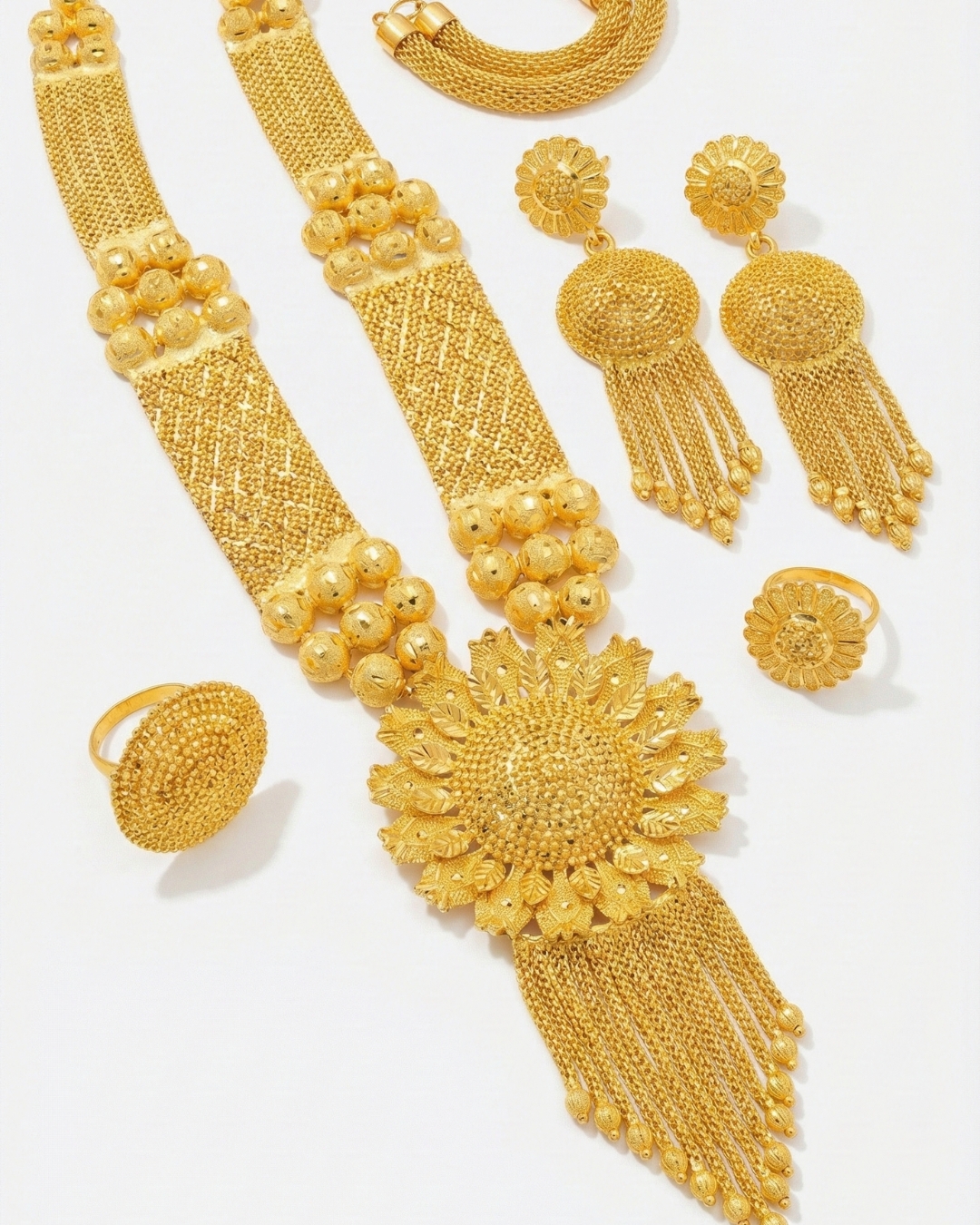 • Premium 2-Gram Gold-Filled Set: A stunning lightweight jewellery collection featuring a long designer necklace, matching statement earrings, and elegant rings — all crafted with a rich gold-filled finish.