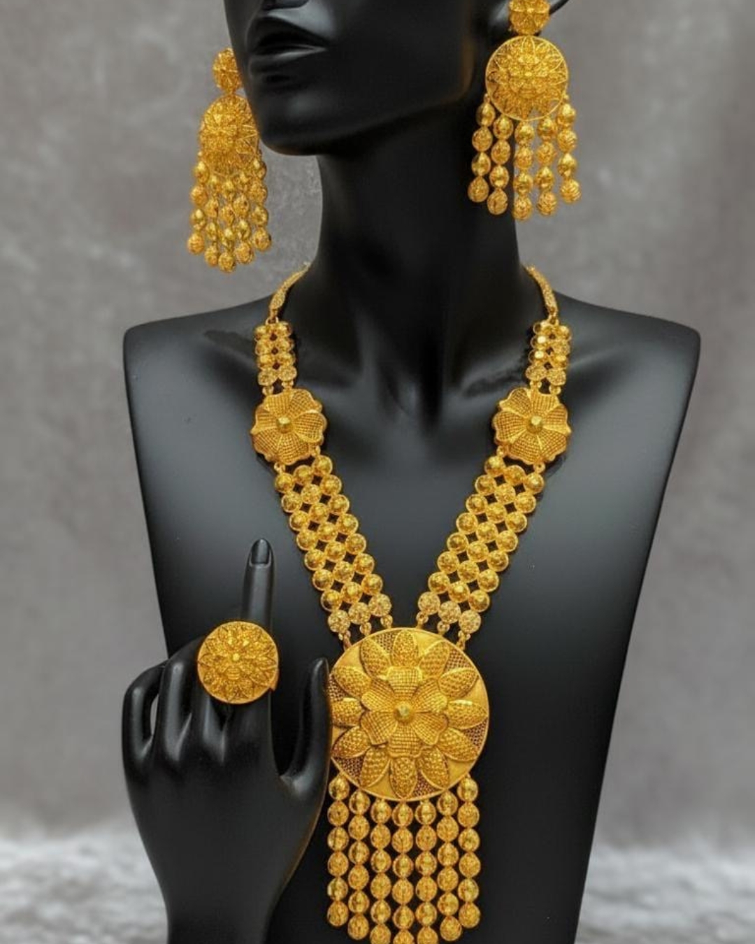 • Premium 5-Gram Gold-Plated Set: A luxurious multi-piece jewellery set featuring a grand necklace, bold earrings, and a matching ring, all finished in rich gold plating.